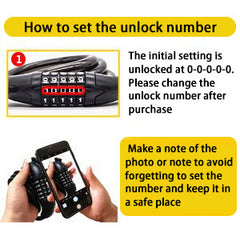 Il nostro lucchetto a cavo utilizza materiali in lega ad alta resistenza. Include un lucchetto a 5 cifre che non può essere aperto senza la chiave.