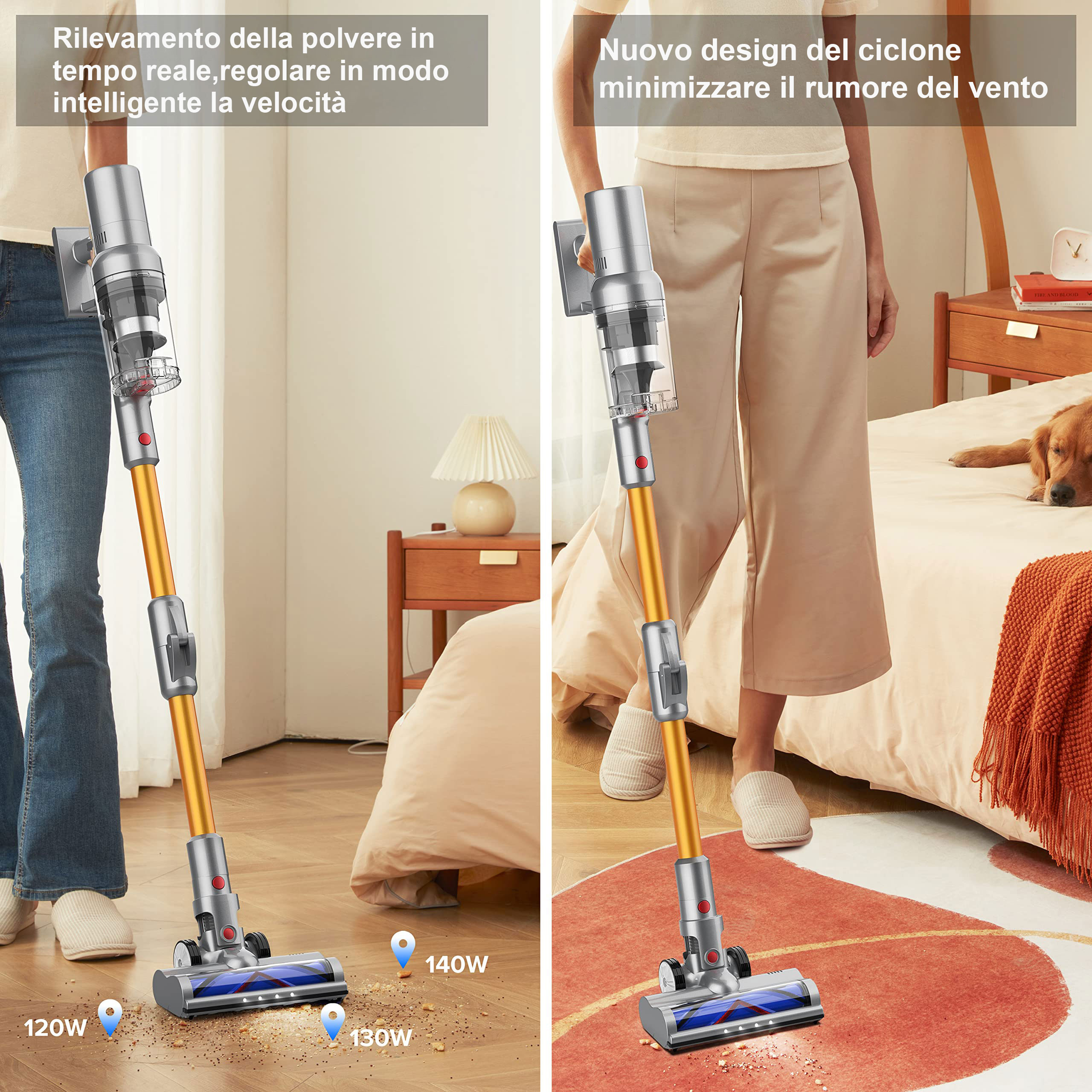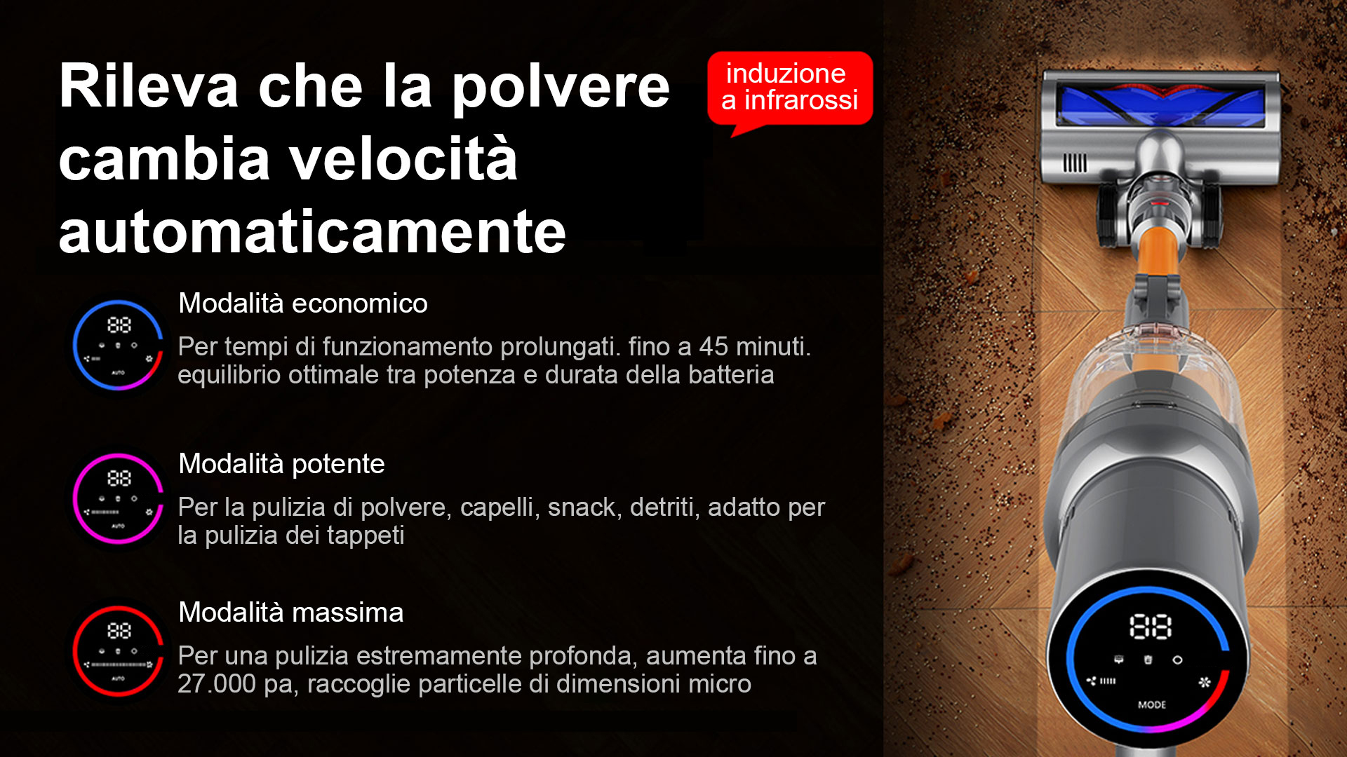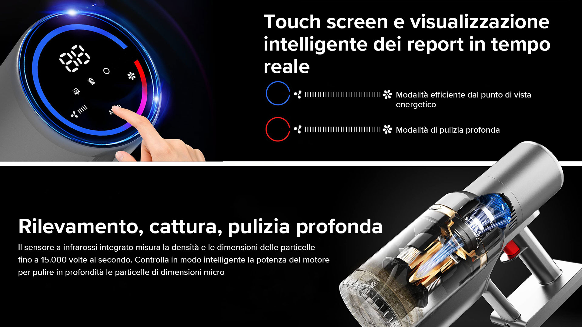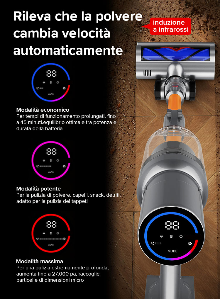 Gli aspirapolvere senza fili sono costruiti con l'ultimo sistema Dust Smart Sensor, che regola automaticamente la potenza di aspirazione in modalità automatica in base alla quantità di detriti e polvere rilevati per ottenere risultati di pulizia ottimali massimizzando al tempo stesso il tempo di esecuzione.