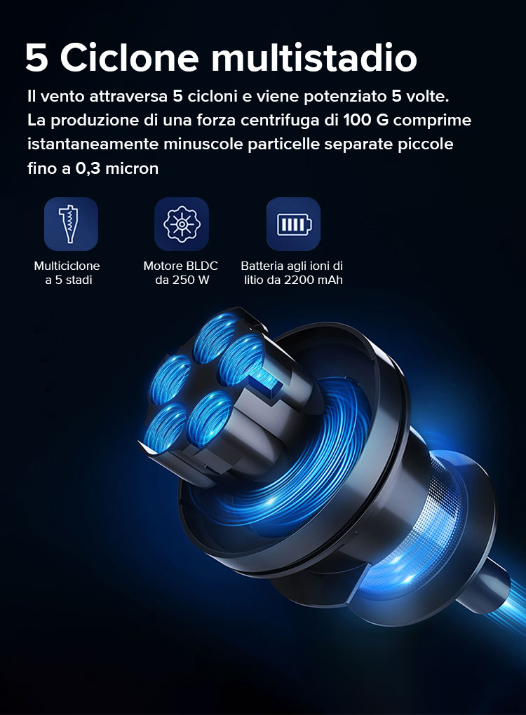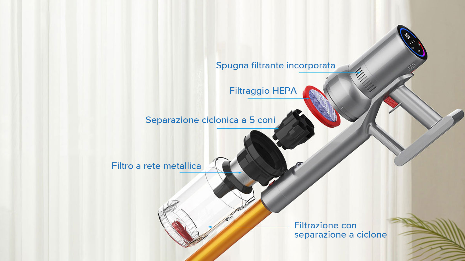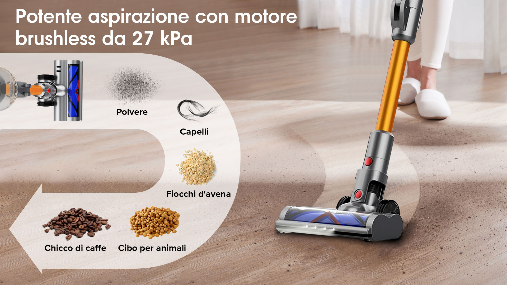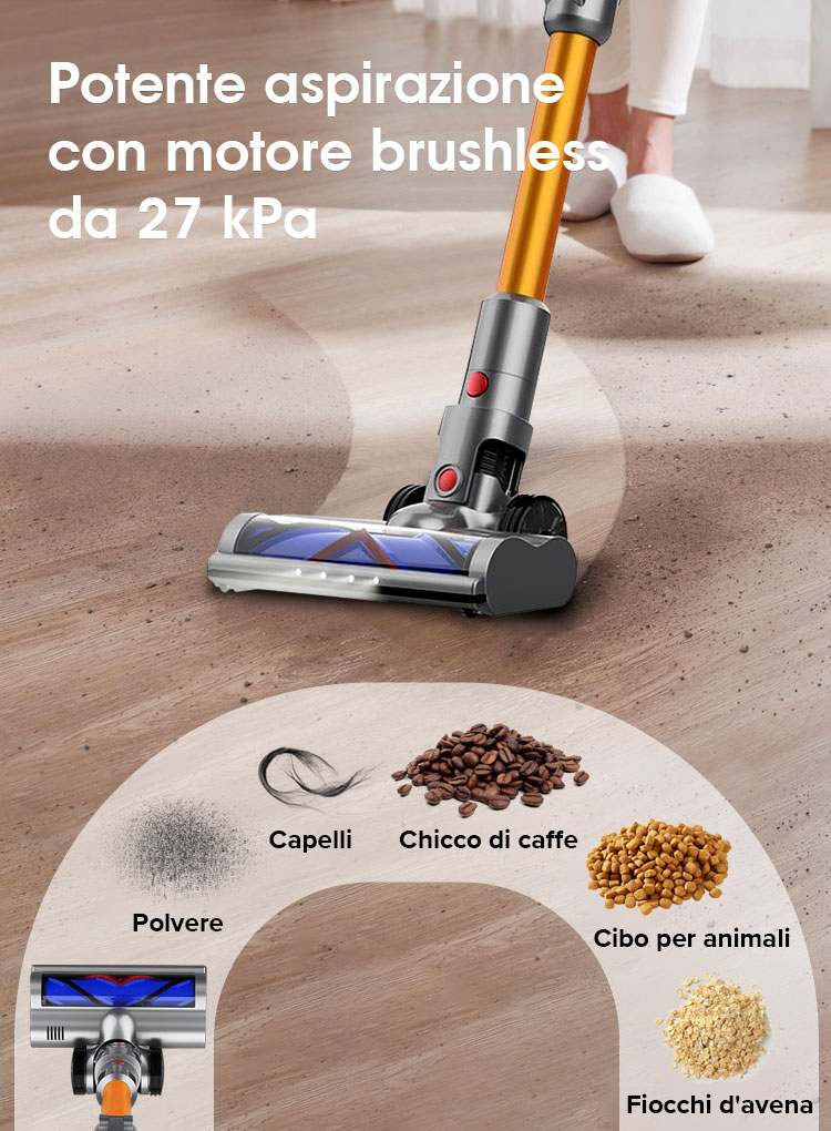 Gli aspirapolvere senza fili sono costruiti con l'ultimo sistema Dust Smart Sensor, che regola automaticamente la potenza di aspirazione in modalità automatica in base alla quantità di detriti e polvere rilevati per ottenere risultati di pulizia ottimali massimizzando al tempo stesso il tempo di esecuzione.