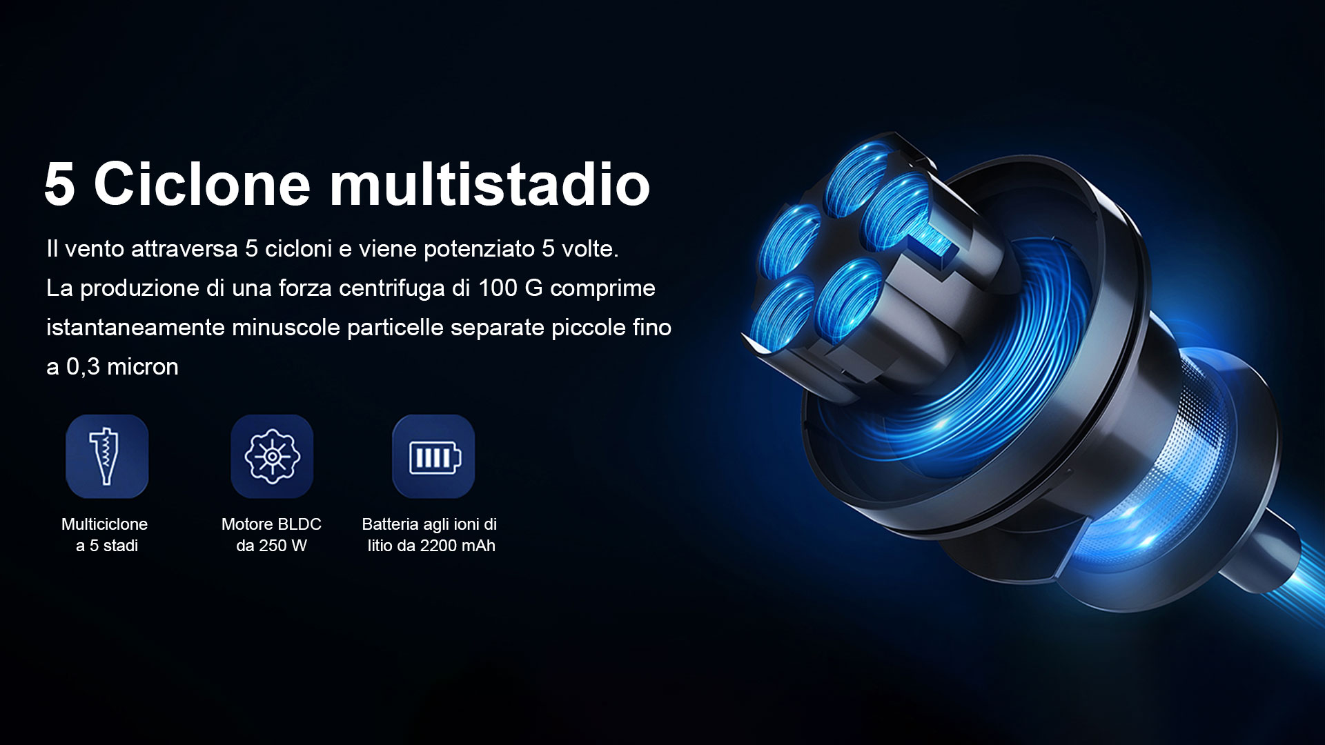 Il potente motore X9 del Cortelec ruota a più di 135.000 giri al minuto, creando un'aspirazione di oltre 27,000 Pa. È quasi in grado di aspirare tutti i tipi di detriti.