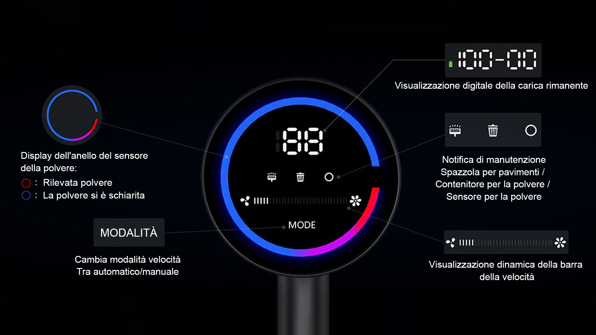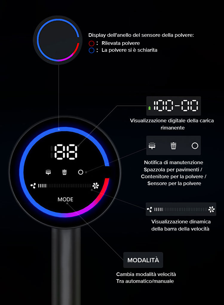 Smart Ring Detect™: rileva la polvere sul pavimento in tempo reale e cambia dinamicamente il colore dell'anello sullo schermo LED