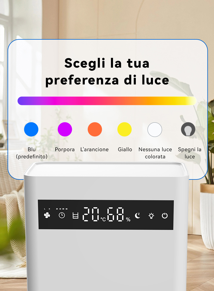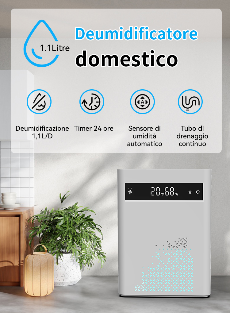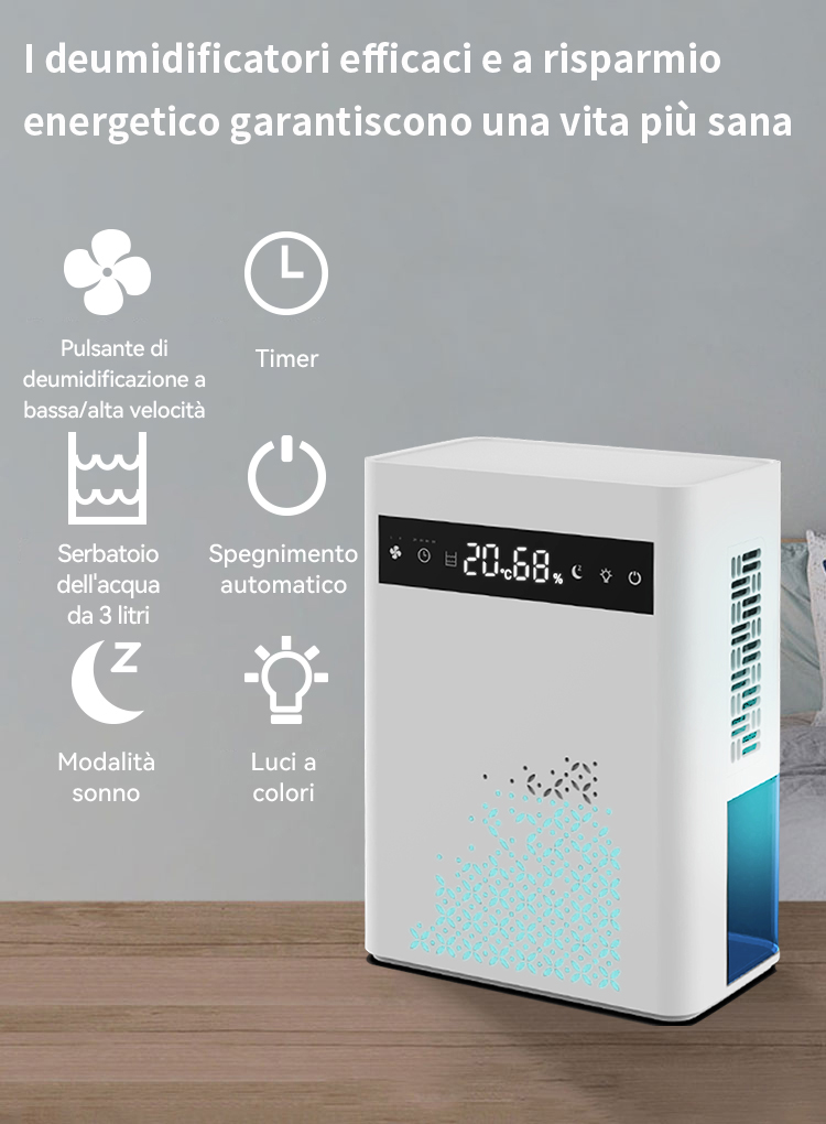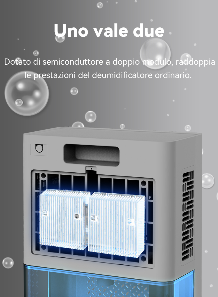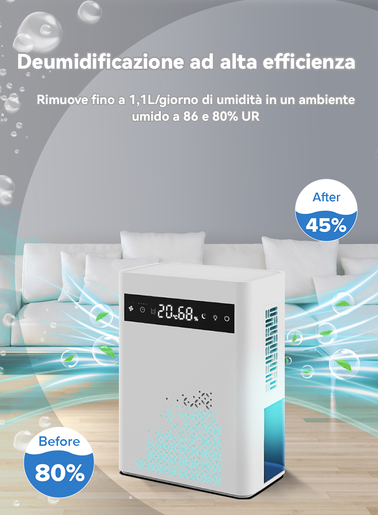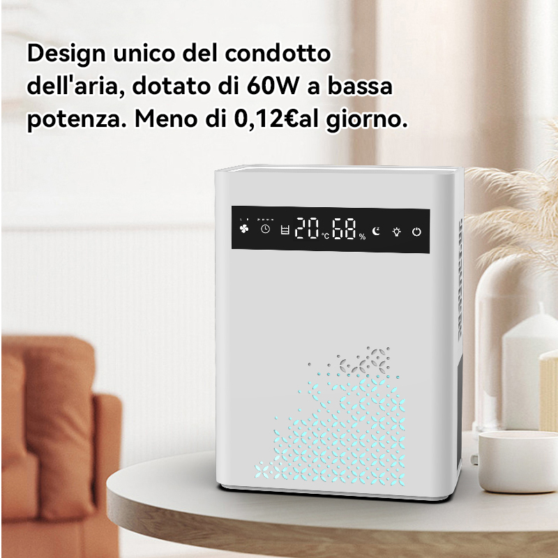 Preleva l'umidità dall'aria per rendere più confortevole l'ambiente grazie a una tecnologia di deumidificazione altamente efficiente.