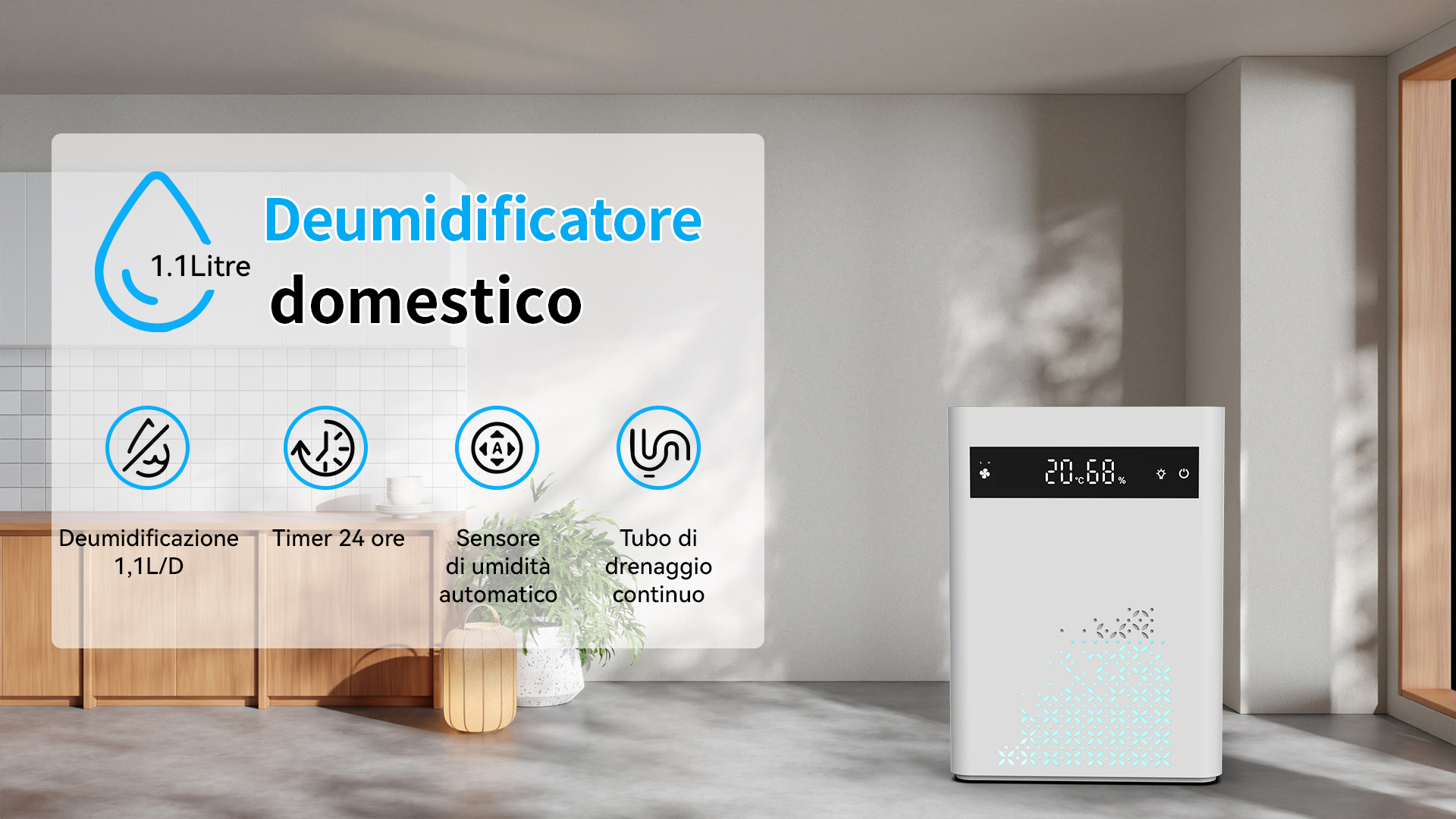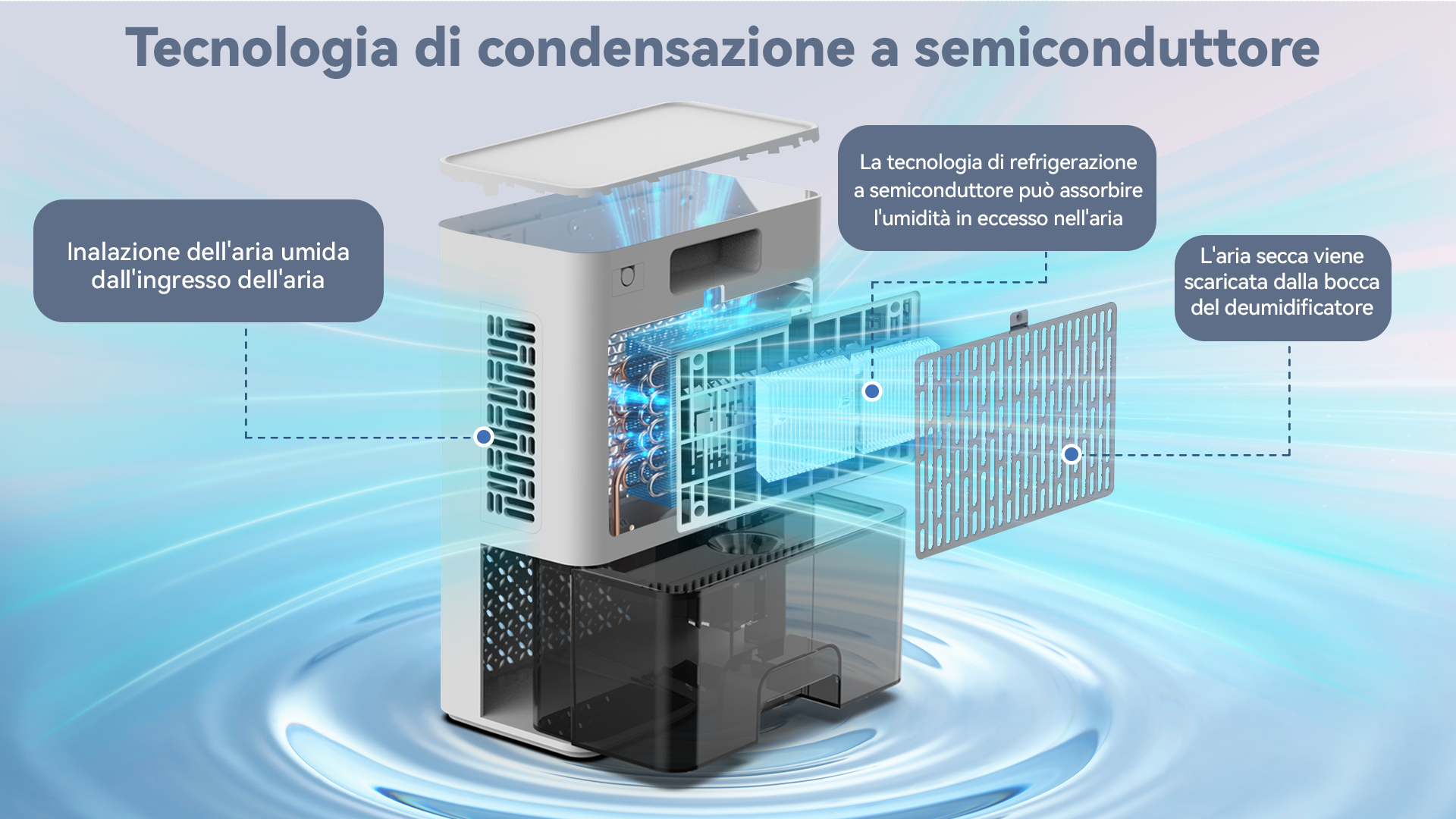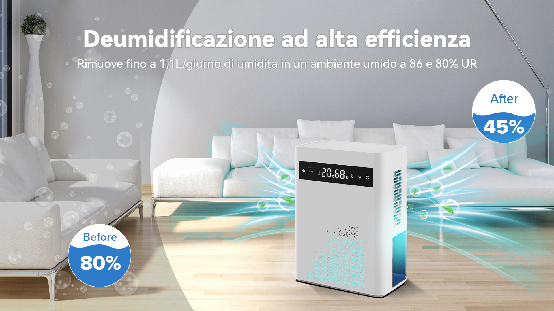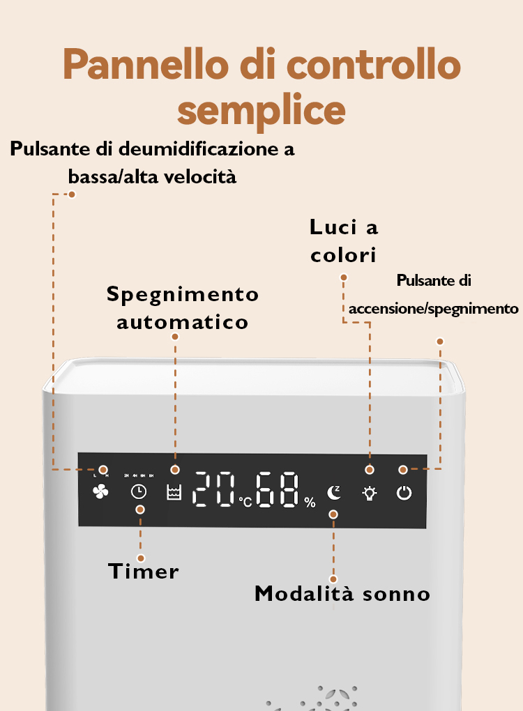 Preleva l'umidità dall'aria per rendere più confortevole l'ambiente grazie a una tecnologia di deumidificazione altamente efficiente.